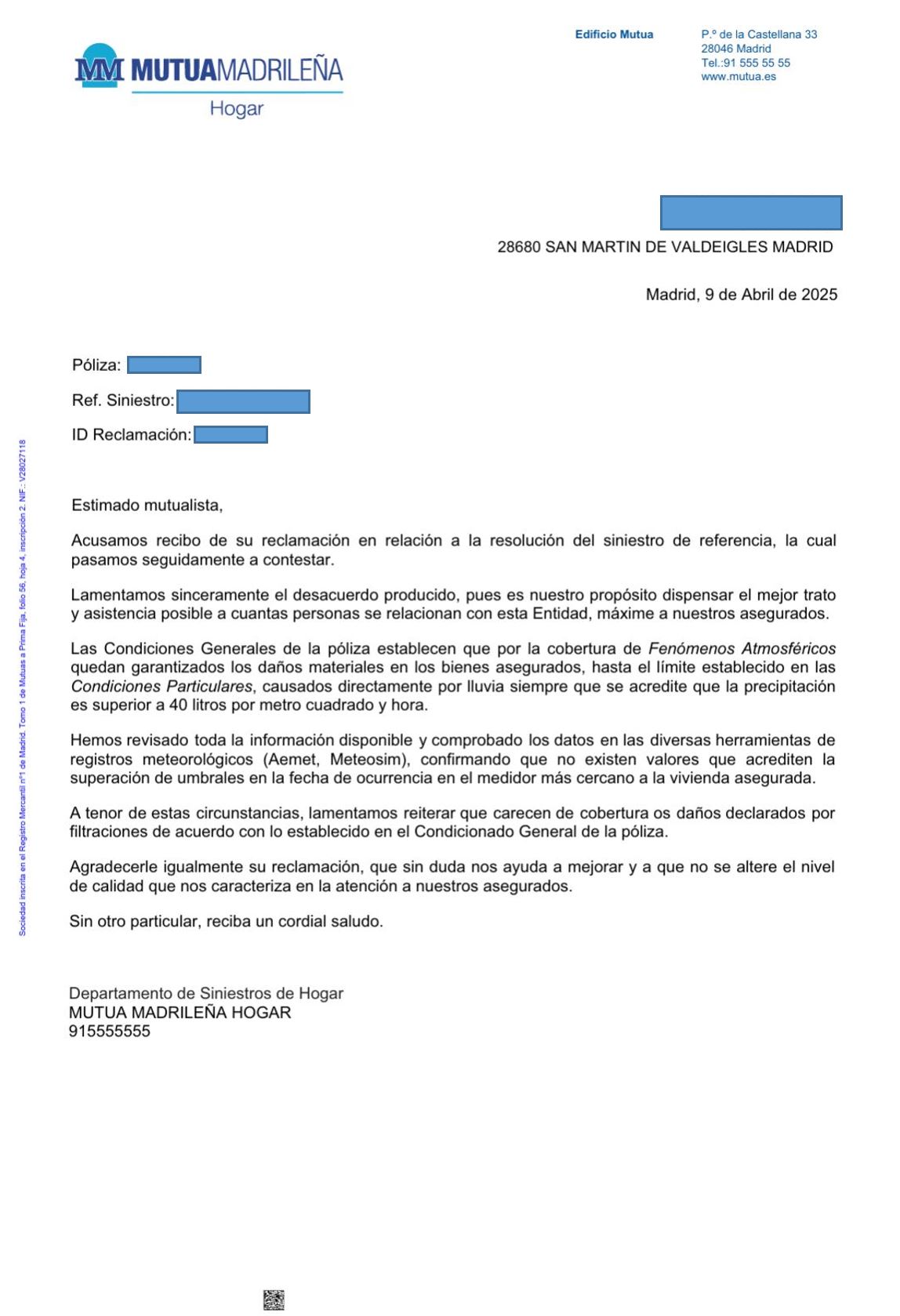 Adjunto respuesta recibida por Mutua de Madrid, inhibiéndose de su responsabilidad y portada del diario comarcal correspondiente a mi domicilio del mes de Marzo 2025.